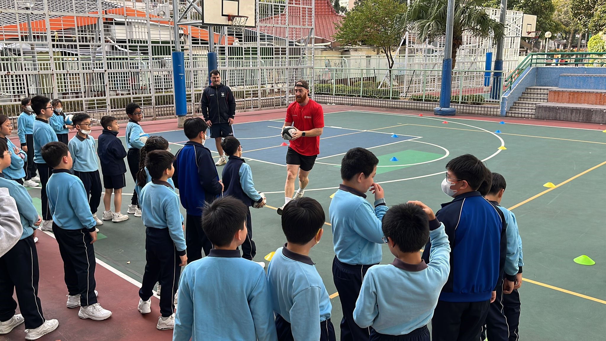 Learning some rugby moves.